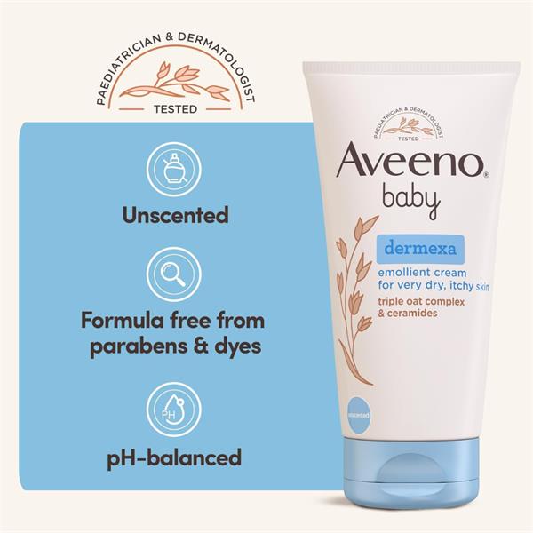 AVEENO® Baby Dermexa Emollient Cream is clinically proven to soothe baby’s dry, itchy skin with immediate effect and helps strengthen the skin's moisture barrier. It helps reduce flare-ups of very dry skin and is also suitable for little ones who may be prone to eczema.