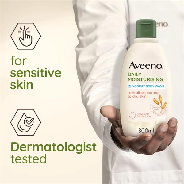 Healthier-looking skin starts in the shower. AVEENO® Daily Moisturising Yogurt Body Wash is formulated with Prebiotic Colloidal Oatmeal and Probiotic Greek Yogurt*. The formula gently cleanses the skin whilst enriching your senses with a delicious Apricot and Honey scent.