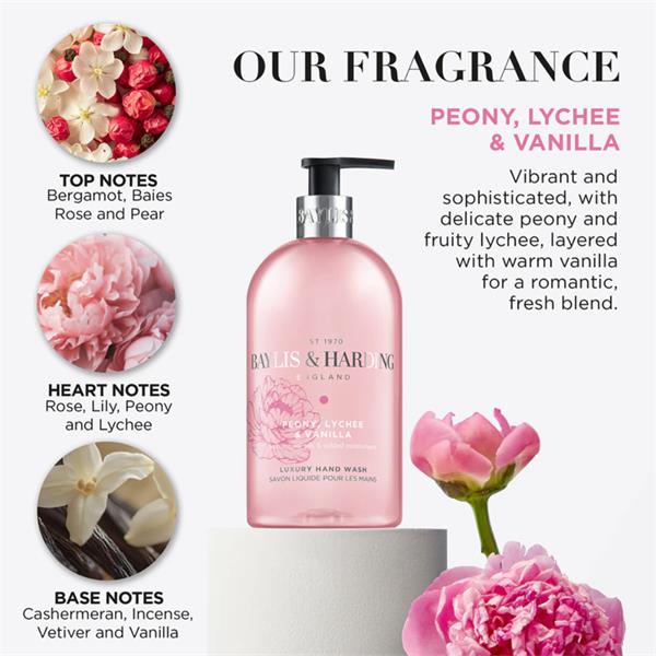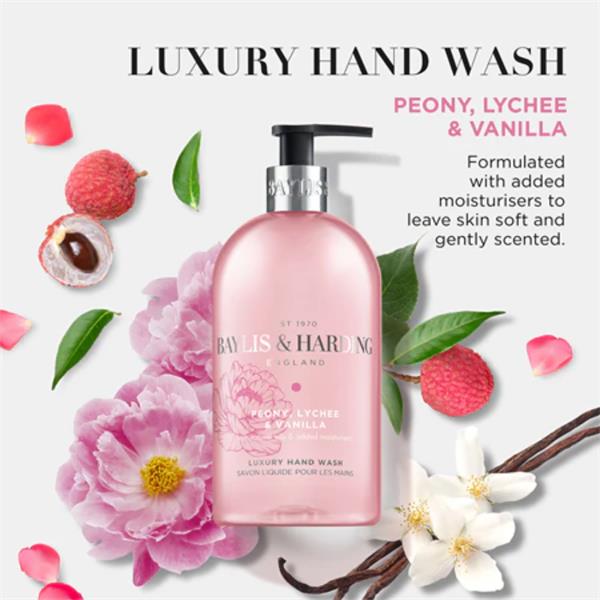 Baylis & Harding Signature Peony, Lychee, Vanilla Hand Wash 500ml. Vibrant and sophisticated hand wash, leaves hands gently scented in Peony, Lychee & Vanilla fragrance. With added moisturisers and natural oils in the fragrance.