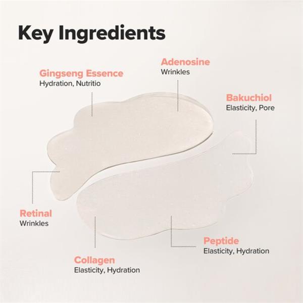 Panax Ginseng Root Water, Water(Aqua), Glycerin, Collagen Water, 1,2-Hexanediol, Chondrus Crispus, Hydroxyacetophenone, Algin, Ceratonia Siliqua (Carob) Gum, Butylene Glycol, Potassium Chloride, Glucomannan, Hydrolyzed Collagen, Xanthan Gum, Sucrose, Titanium Dioxide, Mica, Synthetic Fluorphlogopite, Adenosine, Maltodextrin, Disodium EDTA, Allantoin, Dipotassium Glycyrrhizate, Tin Oxide, Hydrogenated Lecithin, Centella Asiatica Extract, Ficus Carica (Fig) Fruit Extract, Beta-Glucan, Ceramide NP, Caprylyl Glycol, Retinal, Bakuchiol, Acetyl Hexapeptide-8.