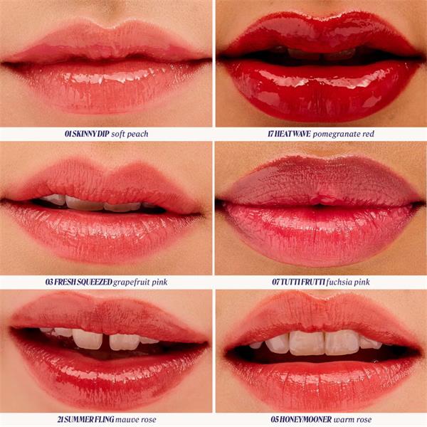 Glaze on the lustrous benefit Splashtint Moisturising Dewy Lip Tint for long-wear, high-shine impact. Arriving in a chic component, the quenching formula plumps the lips with a juicy pop of colour, alongside helping to visibly smooth out fine lines to support a supple, dew-kissed finish.