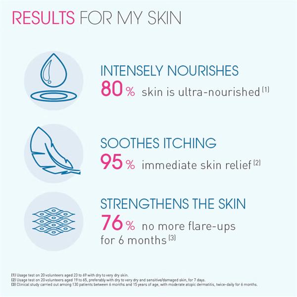 Soothes itching and irritation Biologically rebuilds a healthy skin barrier Restores skin comfort and thus spaces out the occurrence of new irritative phases Improves the whole family's quality of life. Fragrance-free formula Paraben-free Hypoallergenic Non-comedogenic