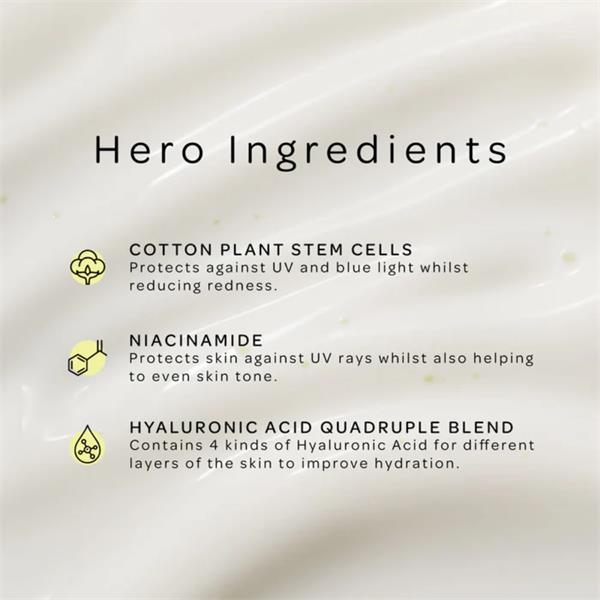 AQUA, ETHYLHEXYL SALICYLATE, C12-15 ALKYL BENZOATE, BIS-ETHYLHEXYLOXYPHENOL METHOXYPHENYL TRIAZINE, PHENYLBENZIMIDAZOLE SULFONIC ACID, DICAPRYLYL CARBONATE, NIACINAMIDE, SILICA, BUTYL METHOXYDIBENZOYL- METHANE, SODIUM POLYACRYLOYLDIMETHYL TAURATE, AMINOMETHYL PROPANOL, PANTHENOL, PROPANEDIOL, GLYCERIN, CAPRYLYL GLYCOL, SODIUM STEAROYL GLUTAMATE, TOCOPHERYL ACETATE, GOSSYPIUM HERBACEUM CALLUSCULTURE, CAPRYLHYDROXAMIC ACID, XANTHAN GUM, DISODIUM EDTA, PENTYLENE GLYCOL, CITRIC ACID, SODIUM ACETYLATED HYALURONATE, SODIUM HYALURONATE, SODIUM HYALURONATE CROSSPOLYMER, HYDROLYZED SODIUM HYALURONATE, ETHYLHEXYLGLYCERIN.