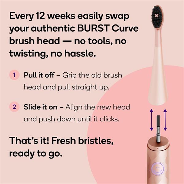 Show off your dazzling smile and perfectly clean teeth. Burst Brush Replacement Head Rose Gold toothbrush replacement head will help you achieve the best possible results with your oral hygiene. Replacing your brush head on a regular basis ensures the same effectivity of brushing you’d get with a new toothbrush.