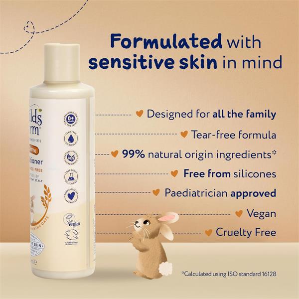 Created to support dry, itchy or sensitive skin, it is clinically proven to help maintain the skin's natural barrier while leaving hair soft, shiny and easy to manage. With 99% natural origin ingredients, including Colloidal Oatmeal and Oat Bran Extract, sustainably sourced from the Nordics, this silicone-free conditioner nourishes both scalp and strands without irritation. Dermatologist and paediatrician approved. Cruelty-free & vegan-friendly.