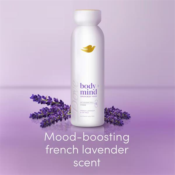 Dove Body + Mind French Lavender & Oat Milk Serum Body Wash is made with antioxidant-rich vitamin E for glowing skin. Offers a sensorial experience that nourishes your skin and resets your mind.