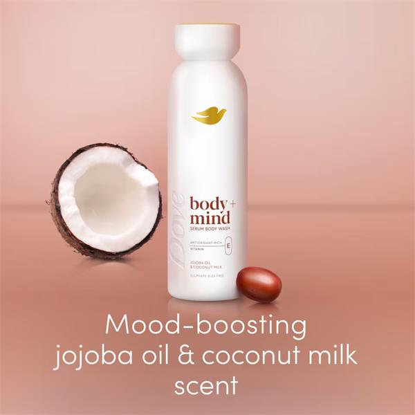 Dove Body + Mind Jojoba Oil & Coconut Milk Serum Body Wash is made with antioxidant-rich vitamin E for glowing skin. Offers a sensorial experience that nourishes your skin and soothes your mind.