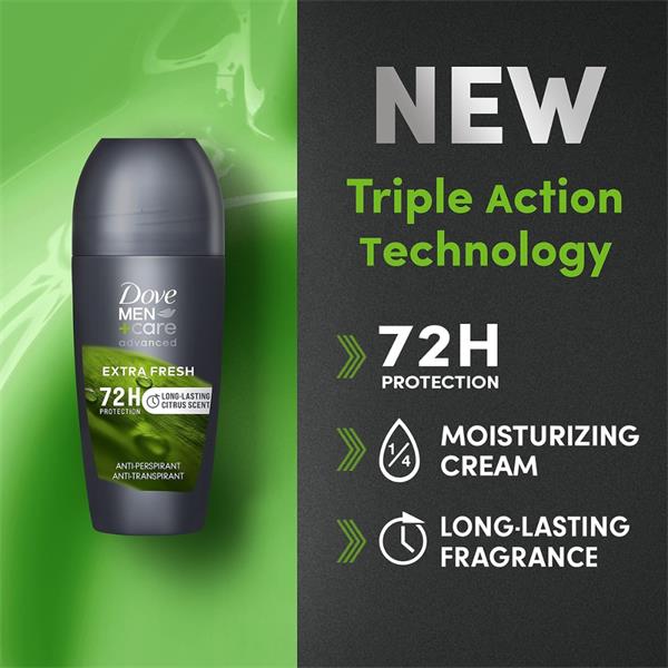 Dove Men Advanced Care Extra Fresh Anti-Perspirant Deodorant Roll-On (50ml) is an alcohol-free, reviving anti-perspirant deodorant made with Dove's Advanced Care formula which cares for your skin while keeping it feeling fresh with 72-hour protection from odour and sweat.