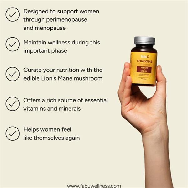 FabÜ SHROOMS MENO & PERI is unique supplement with seven active ingredients. It is based on the concentrated extract of the edible mushroom Lion's Mane, blended with Vitamin D, Vitamin K2, Vitamin B6, Vitamin B12 and Chromium tailored specifically to support a woman's journey through perimenopause and menopause.