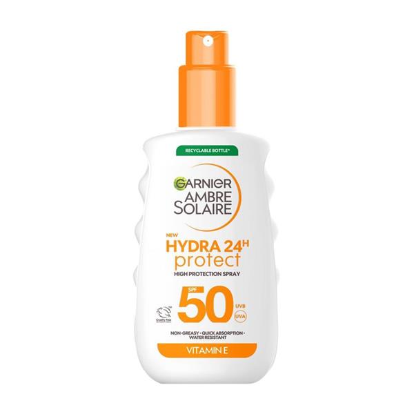 Garnier Ambre Solaire Hydra 24 Hour Protect Sun Protection Spray SPF50 provides advanced UVB and UVA protection against sun induced skin damage. Now enriched with Vitamin E, this ultra-hydrating formula helps to prevent sun induced dark spots and leaves skin hydrated. Water resistant, non-greasy, fast absorption.