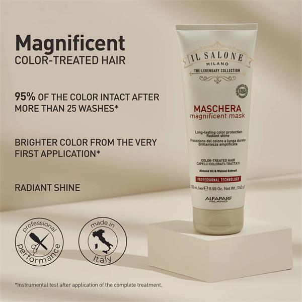 The Alfaparf Il Salone Magnificent Mask is a luxurious treatment specifically formulated for color-treated hair. Enriched with nourishing ingredients, this mask aims to revitalize and maintain the vibrancy of colored hair while providing deep hydration and repair.