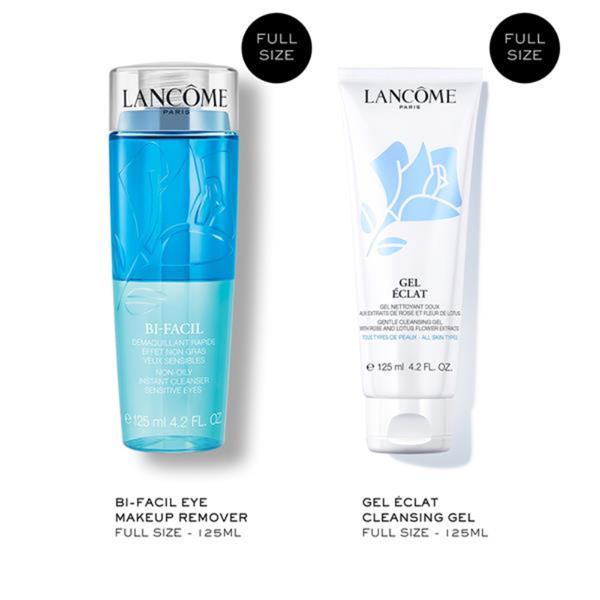 Lancôme’s Bi-Facil Cleanser Set, featuring Bi-Facil to gently lift off all types of eye makeup, even waterproof, and Gel Eclat to deeply cleanse, smooth the skin, and help reduce the appearance of pores for a fresh, refined complexion.