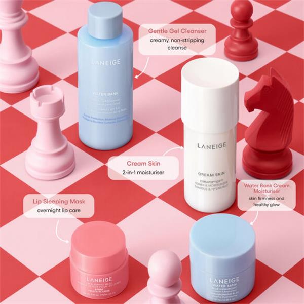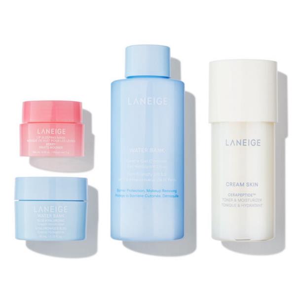 Start skincare routines with the Water Bank Gentle Gel Cleanser, which transforms into a creamy, non-abrasive lather that purifies, exfoliates and hydrates. With its lightweight, liquid texture, the Cream Skin Cerapeptide Toner and Moisturiser firms and strengthens the skin barrier without feeling heavy or greasy.