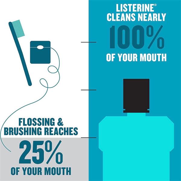 Protect your mouth from germs and get fresh breath with Listerine Cool Mint Antiseptic Mouthwash. It kills 99.9% of germs that cause bad breath, plaque and gingivitis, for a fresher and cleaner mouth than brushing alone. This germ-killing mouthwash for bad breath is clinically shown to reduce plaque 52% more and reduce gingivitis 21% more than brushing and flossing alone. Adding a 30-second rinse to your morning and evening routines is all it takes to get 24-hour germ protection and achieve maximum results. Listerine Cool Mint Antiseptic Mouthwash leaves your mouth feeling intensely clean.