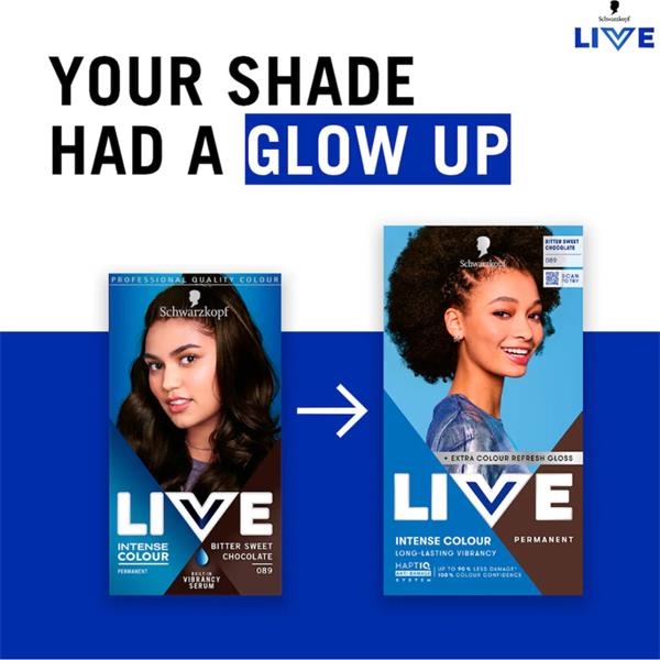 Long-lasting permanent hair colouration with Extra Colour Refresh GlossFind your perfect shade in our diverse shade range. LIVE's intense colours and HaptIQ Anti-Damage System deliver up to 8 weeks of unstoppable colour while rebuilding your hair bonds. This hair colour kit also contains Extra Colour Refresh Gloss for that first-day colour. Use after 3-4 weeks for the ultimate vibrancy boost.Vegan formula**. 100% recycled aluminium tube. Be smarter. Recycle.***Same colour you love, now with HaptiQ anti-damage system that cares for the hair by restoring its strength for up to 90% less hair breakage and 100% colour confidence. Schwarzkopf's HaptIQ Anti-Damage System rebuilds and protects hair bonds as you colour. Newly created micro-bonds within the hair, envelop the hair with a protective layer after colouration, reducing damage up to 90%* and giving 100% colour confidence.