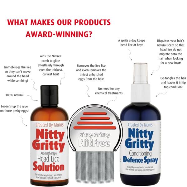 The Nitty Gritty Comb was designed by a group of mothers who no longer wanted to use unpleasant chemicals to remove head lice from their children. The comb has 33 round tipped teeth which goes through the hair very easily and each one of the micro-spiral grooves gently removes anything that's attached to the hair such as lice, nits and even un-hatched 'live' louse eggs.