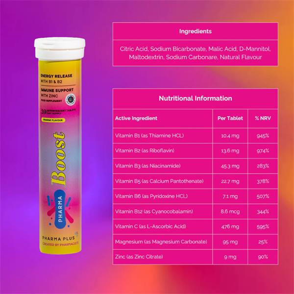 Feel energised and support your immune system with Pharma Plus Pharma Boost Effervescent – your daily dose of vitality in a convenient, orange-flavoured tablet.