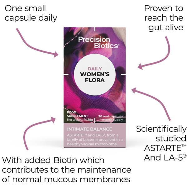 PrecisionBiotics® Women's Flora is specially designed for women seeking to maintain a healthy balance of yeast and bacteria in their intimate area, featuring the scientifically researched ASTARTE™ and LA-5® a blend of lactobacilli.