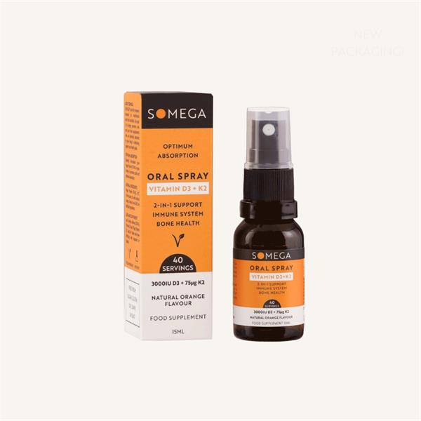 Pure and natural Vitamin D3 + K2 Oral Spray with natural orange flavour. High strength with 3000IU Vitamin D3 and 75µg Vitamin K2 per 3 spray serving. Combines health benefits of Vitamin D and Vitamin K and enhanced support for healthy bones. Expertly formulated to be optimally absorbed through the soft tissue of the mouth.