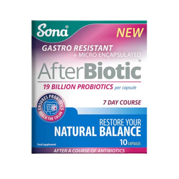 Sona AfterBiotic contains 21 billion micro-organisms  per capsule. AfterBiotic is a seven day course of  probiotics for use after a course of antibiotics.