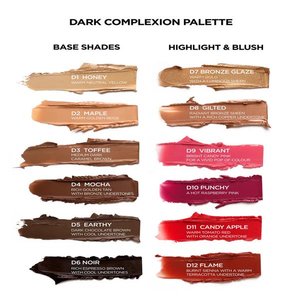 Dark: This palette delivers six buildable base shades with neutral, red, and golden undertones for smooth, seamless coverage. With four bold blushes and two glazed highlighters, it’s built to define, pop, and illuminate.