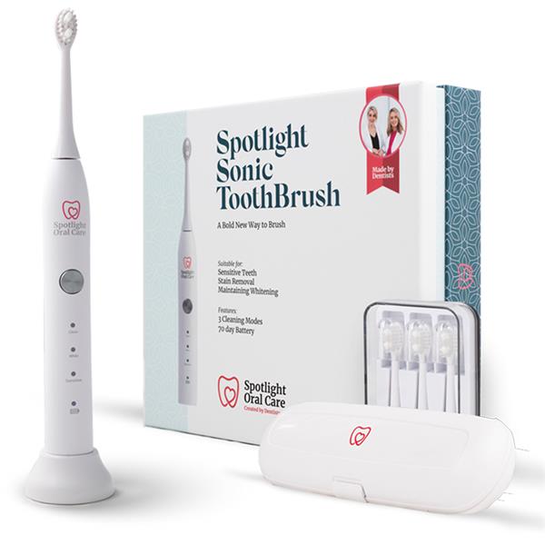 A game changer, the Spotlight Oral Care Sonic Toothbrush uses professionally designed sonic technology which allows the gentle feel of a manual toothbrush with an actual deep clean effect. The sonic toothbrush was designed with both efficiency and comfort in mind. This toothbrush has three different settings with various amplitude ranges to suit every individual need. 3 speed settings: Sensitive – 31000 reps/min – Gentle Care, Clean – 41000 reps/min – Clean and White – 48000 reps/min – Intense surface stain removal.