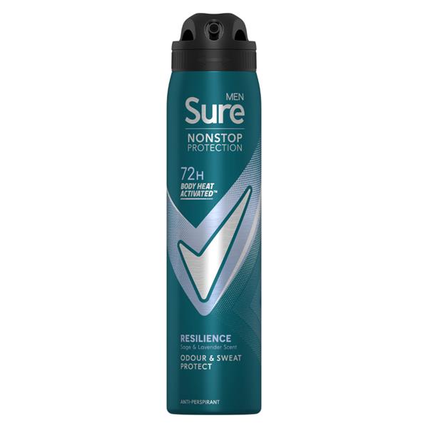 Sure Men Nonstop Protection Resilience Anti-Perspirant Aerosol Deodorant provides 72-hour non-stop protection against odour and sweat so you're always ready to keep moving. Its alcohol-free* formula keeps your underarms feeling clean, fresh and dry all day without causing irritation. This antiperspirant deodorant for men uses Sures patented Body Heat Activated technology that works hard when the heat is on, forming a strong protective barrier as your body heat rises and giving you unstoppable confidence with a soothing sage and lavender scent. Whether you're cheering on your favourite team, playing hard out and about or just meeting up with friends, this men's deodorant spray will give you all the backup you need. When you work hard, Sure works harder. Our antiperspirant cans are made with infinitely recyclable aluminium please recycle. Lets move together for a more sustainable future. At Sure, we want to inspire confidence in everyone to move more and go further. Were here to support your journey with an antiperspirant that allows you to always be protected and ready for whatever happens.