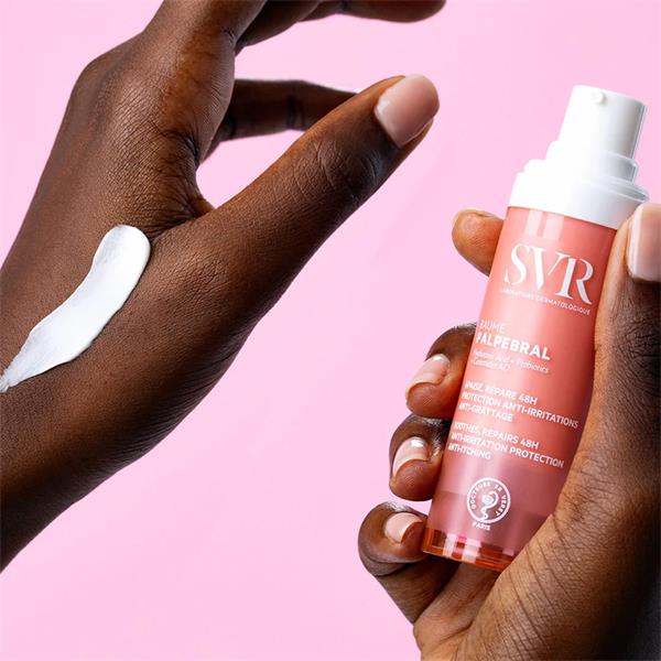 PALPEBRAL Balm moisturises and restores the skin barrier and hydrolipidic film to instantly soothe and lastingly reduce discomfort for 24 hours1. Rich in hyaluronic acid and Omega 3, 6 and 9 combined with SVR's patented AD Ceramides, it protects the skin from environmental stressors such as cold, central heating, pollution, friction against clothing etc. Its rich, melting texture is fragrance-free and a real pleasure to use.