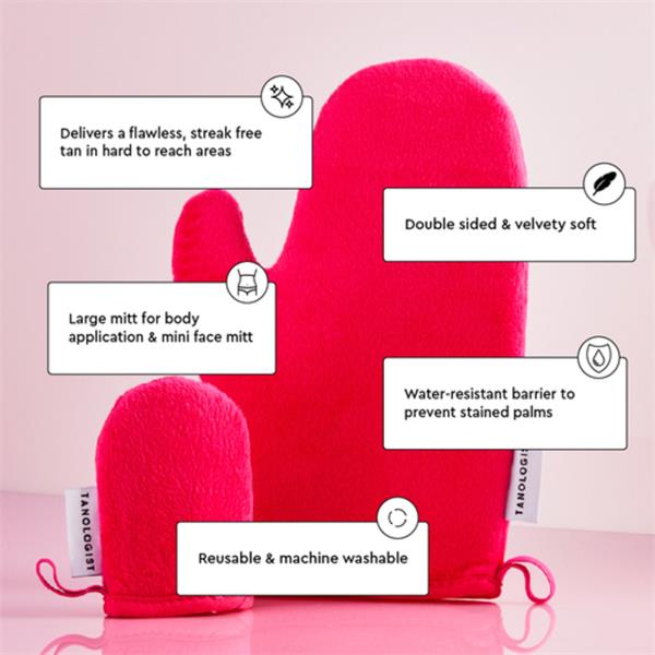 Apply seamless, even tan with the Tanologist Mitt Duo. This set features one body mitt and one mini face mitt, perfect for gliding on your preferred bronzing formula.