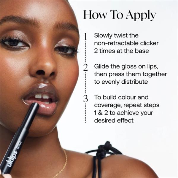 2. Glide the angular gloss along the upper and lower lips before gently pressing together to transfer and evenly distribute the product